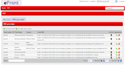 eFront had for some time now an RSS module that could fetch and present an RSS feed inside a lesson or on administrator’s panel. However, until now we could not expose data from eFront as an RSS feed.